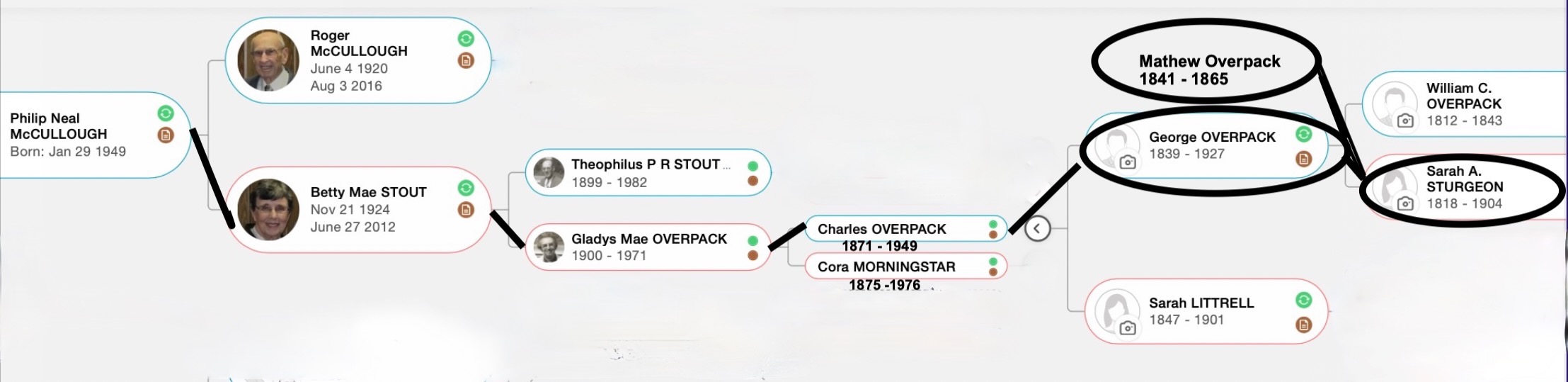 - Matthew Overpack — Private, age 21, entered service Aug. 9, 1862, 3 yrs. Captured June 15, 1863, at battle of Winchester, Va.; wounded June 5, 1864, in action; appointed from Corporal July 1, 1864; died April 5, 1865, of wounds received April 2, 1865, in action near Petersburg, Va.