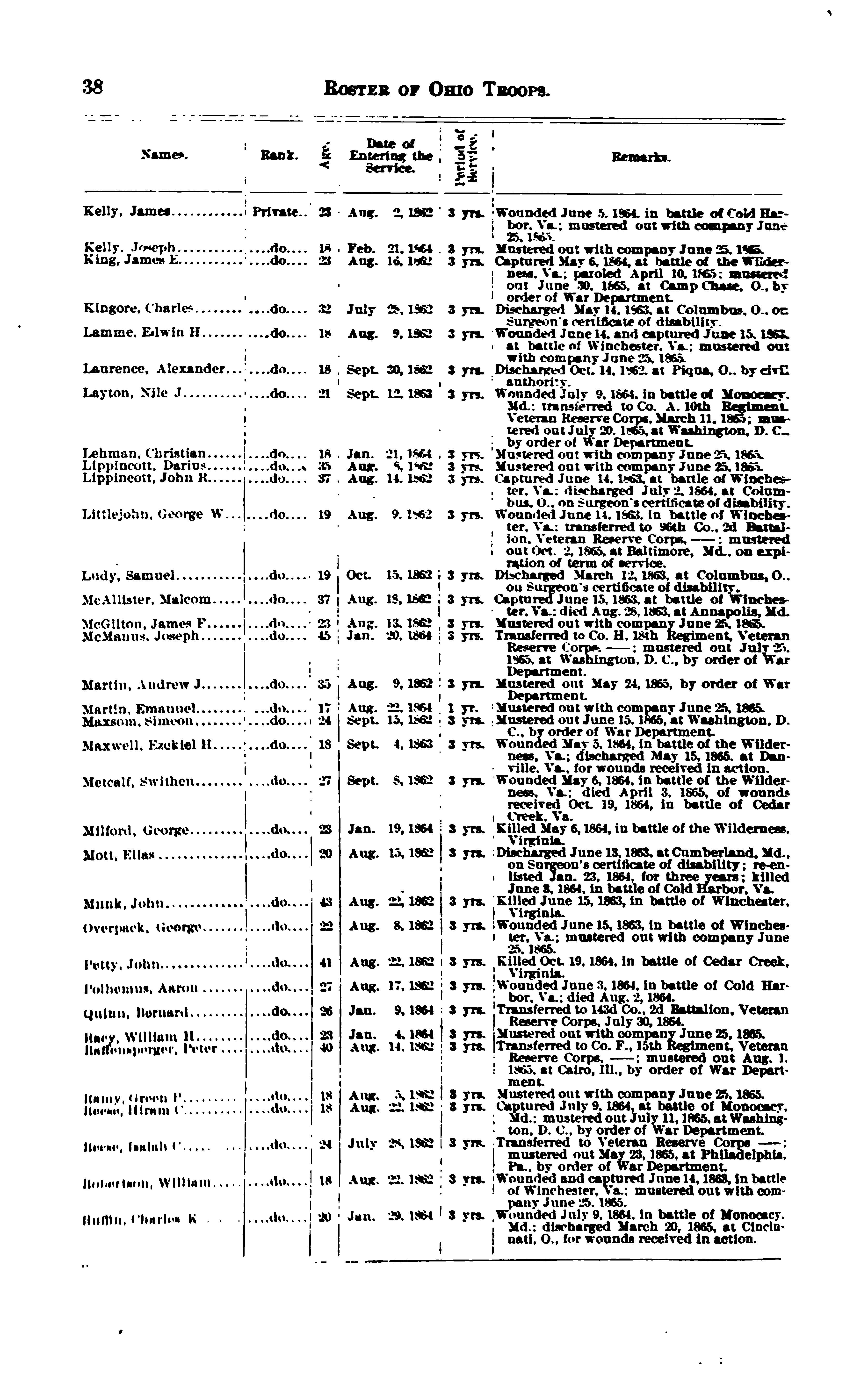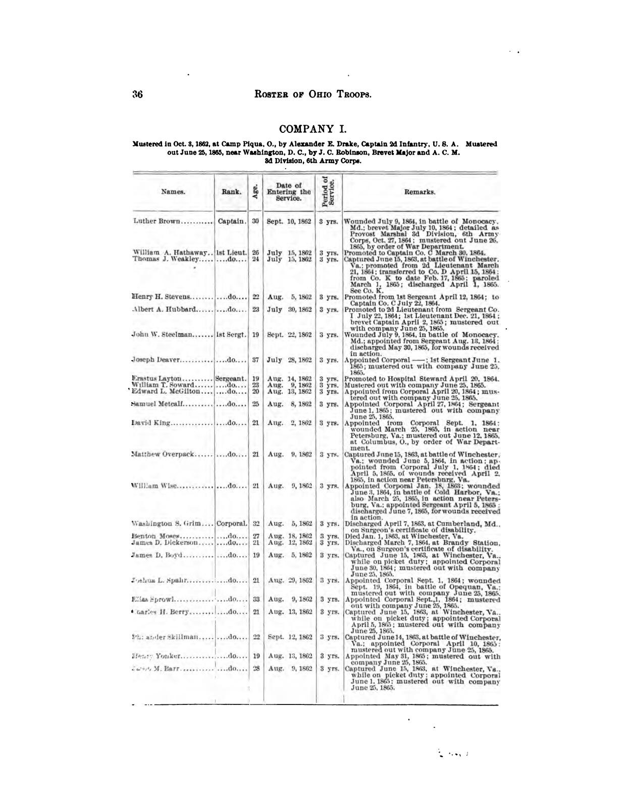 - George W. Overpack — Private, age 22, entered service Aug. 8, 1862, 3 yrs. Wounded June 15, 1863, in battle of Winchester, Va.; mustered out with company June 25, 1865.